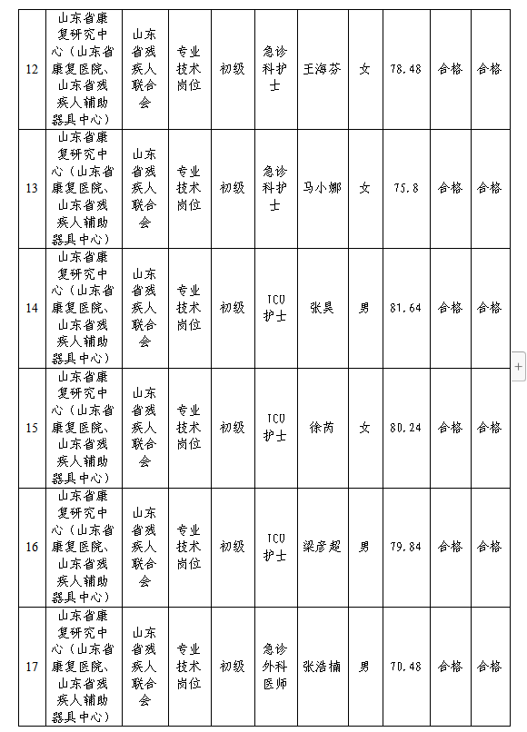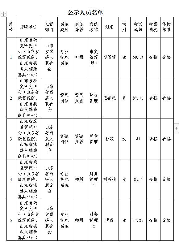 根據省委組織部、省人力資源社會保障廳《關于印發2023年度省屬事業單位公開招聘工作實施方案的通知》(魯人社發〔2022〕23號)等相關規定,按照崗位招聘計劃,省康復研究中心組織完成了2023年公開招聘考試、考察、體檢等工作,現對該單位擬聘用人員進行公示。公示期為7個工作日,自2023年9月26日至2023年10月10日(不含節假日)。公示期間,如對公示人選有異議,請及時向省殘聯反映。