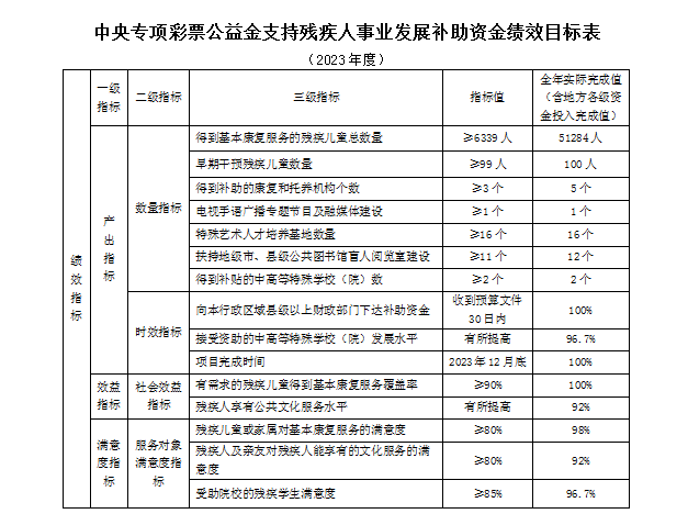 對照殘疾人事業發展補助中央轉移支付資金2023年度績效總體目標,我省已全部完成,具體情況如下:1.通過實施殘疾兒童康復救助,年度內為5.1萬名殘疾兒童提供人工耳蝸及助聽器驗配、肢體矯治手術、唇腭裂手術、功能訓練等服務,顯著改善兒童功能狀況,增強自理和社會參與能力,實現“應救盡救”。為100名小齡殘疾兒童提供親子同訓、家長培訓等以家庭為中心的早期干預康復服務。2.通過為殘疾人康復和托養機構配置設施設備,提升了殘疾人機構服務能力。3.通過扶持特殊藝術人才培養基地、建設地市級公共圖書館盲人閱覽室、電視手語欄目及融媒體等項目,使殘疾人參與文化活動的需求得到了進一步滿足。全省各級殘聯開展文化服務活動、公益演出及無障礙觀影等200余場次,惠及9000余名殘疾人。通過實施電視手語欄目及融媒體建設項目,進一步提升殘聯傳播力、影響力。4.通過資助中高等特殊教育學校(院),進一步改善了辦學條件,加強了實訓基地建設,提高了特殊教育質量,使更多殘疾人獲得了受教育的機會。