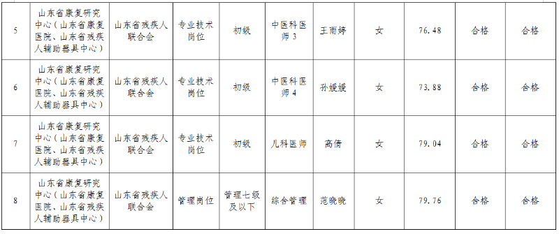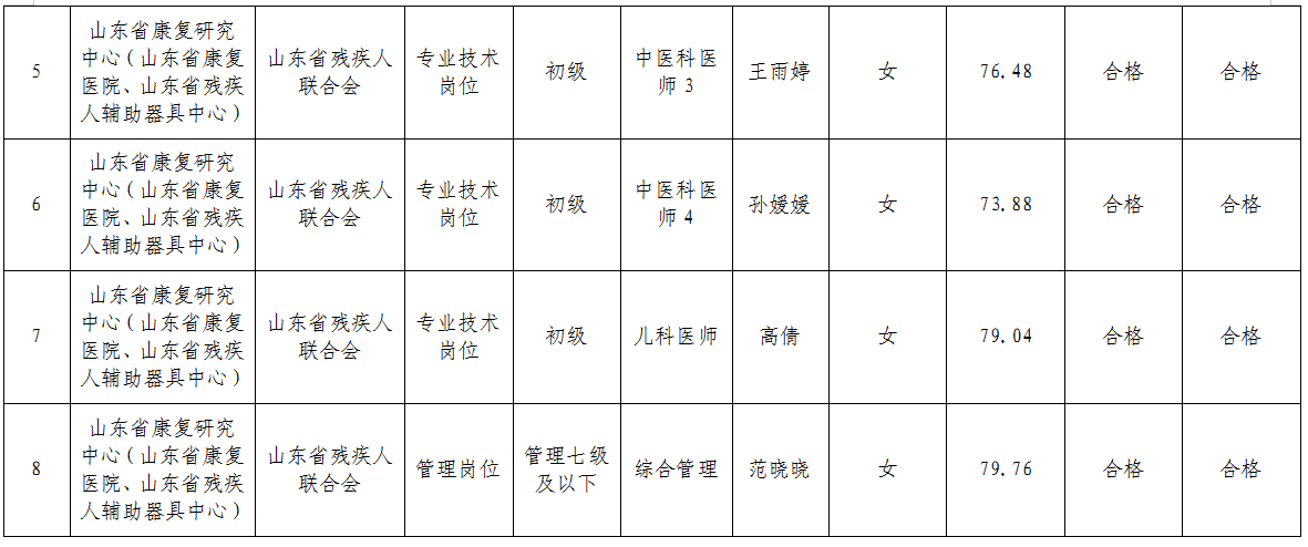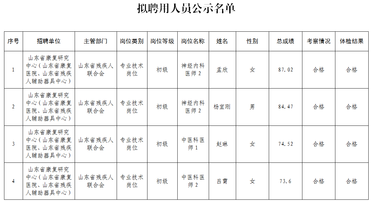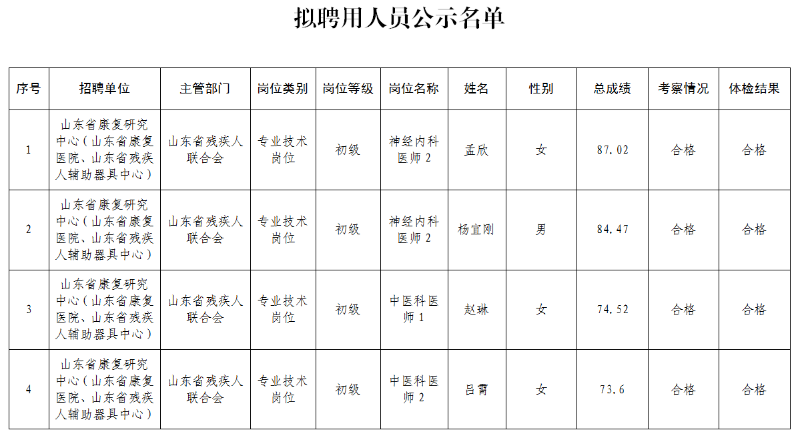 根據(jù)《2025年度省屬事業(yè)單位公開招聘工作實(shí)施方案》(魯人社發(fā)〔2024〕15號(hào))等相關(guān)規(guī)定,按照崗位招聘計(jì)劃,山東省康復(fù)研究中心(山東省康復(fù)醫(yī)院、山東省殘疾人輔助器具中心)組織完成了2025年度公開招聘筆試、面試、考察、體檢等工作,現(xiàn)將該單位擬聘用人員予以公示。